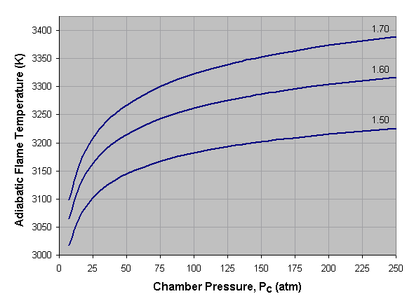 Nitrogen Tetroxide and Aerozine 50 is the one propellant in which the author's calculations vary significantly from practice. In actual use, mixture ratios near 1.90 are commonly used. The chart below gives optimum mixture ratios as calculated by the author. For alternative charts, click here.